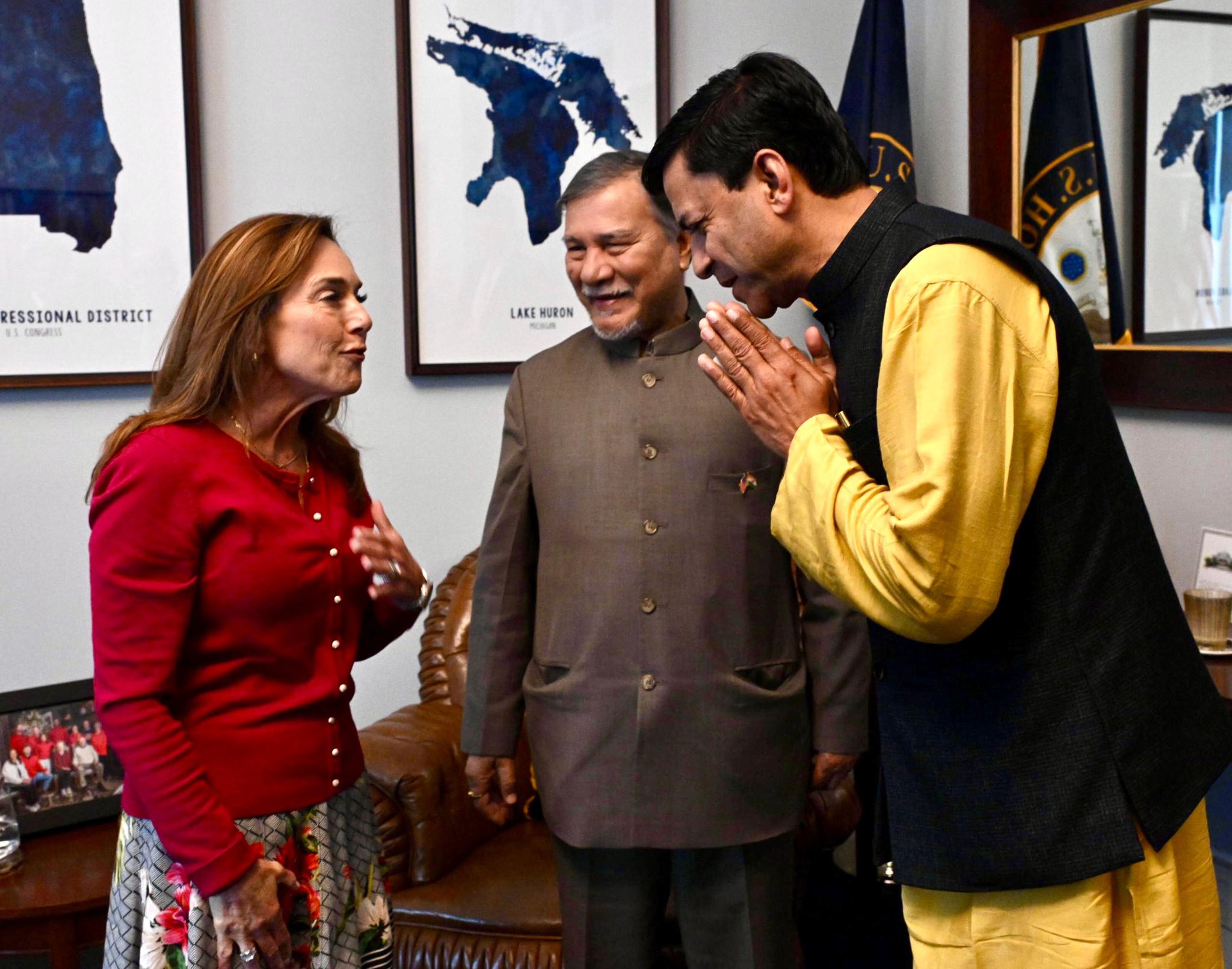 Members of the visiting Indian parliamentary delegation—Shashank Mani, Bhubaneswar Kalita, and Ganti Harish Madhur—held a meeting in Washington, D.C. with U.S. Congresswoman Lisa McClain, Chair of the House Republican Conference and the highest-ranking woman in the U.S. Congress.
