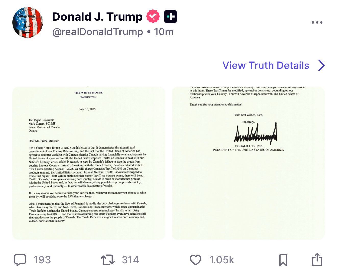 POTUS Donald Trump has threatened a 35% tariff on all Canadian exports to the U.S., effective August 1. The warning, delivered in a formal letter to Prime Minister Mark Carney and posted on Trump’s Truth Social, signals a major escalation in his trade offensive ahead of stalled USMCA talks.